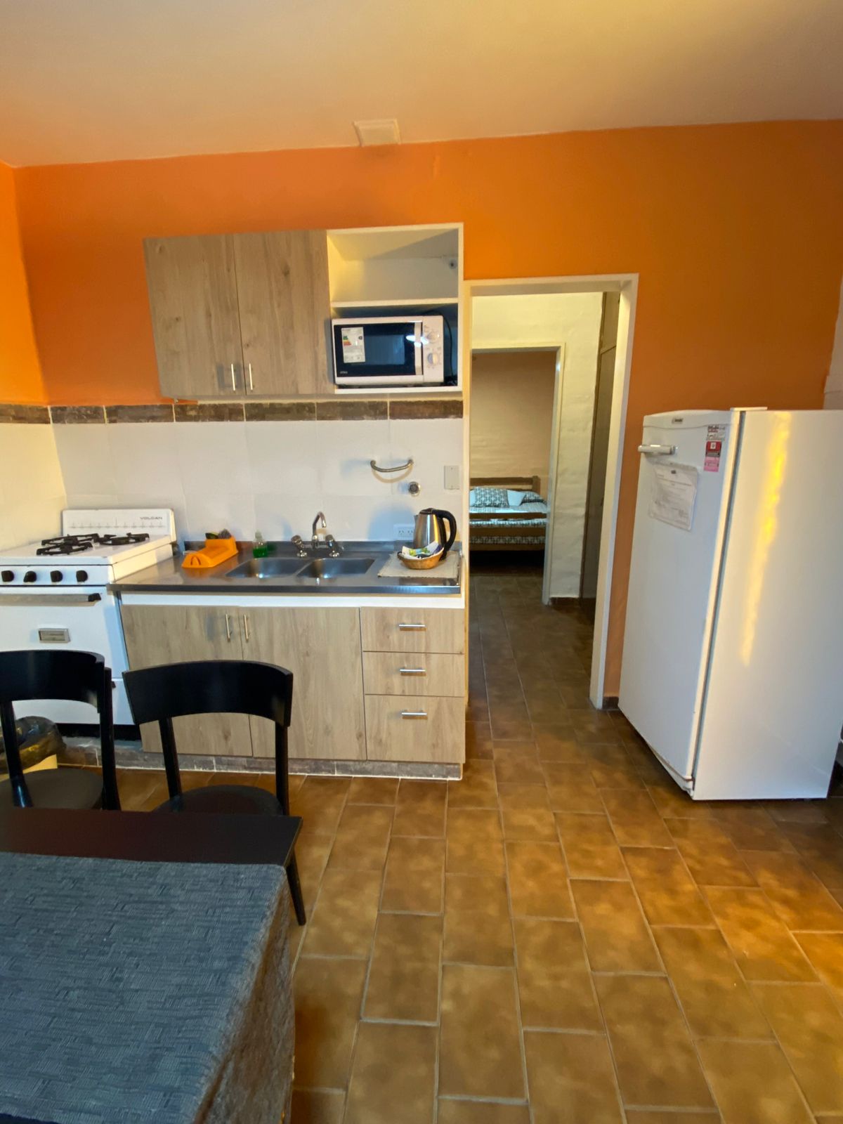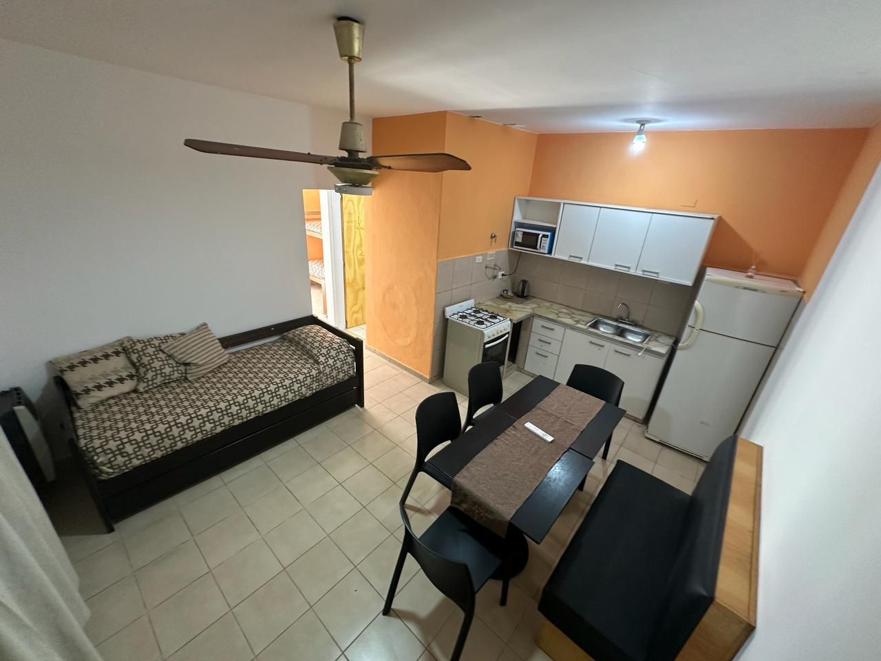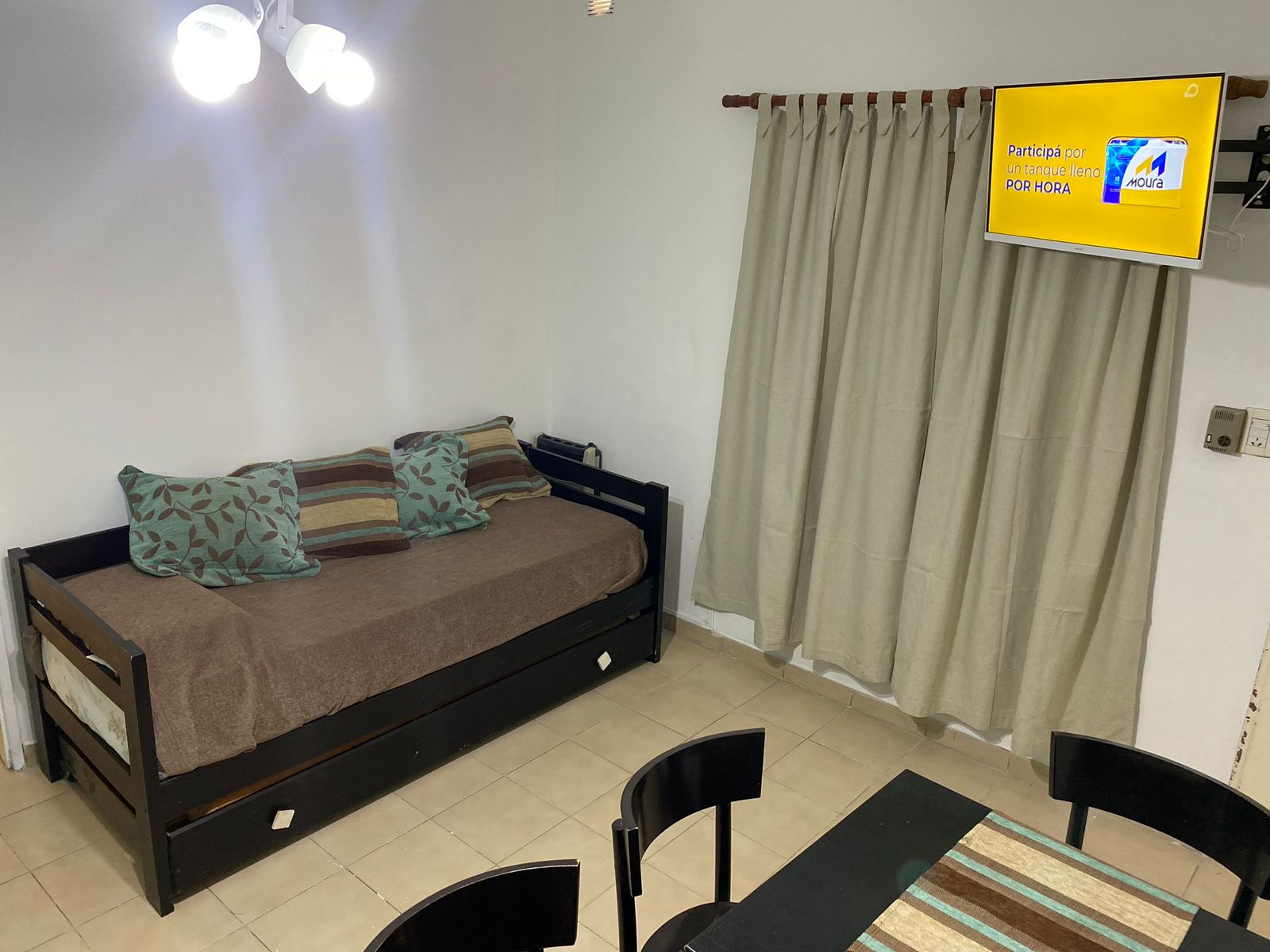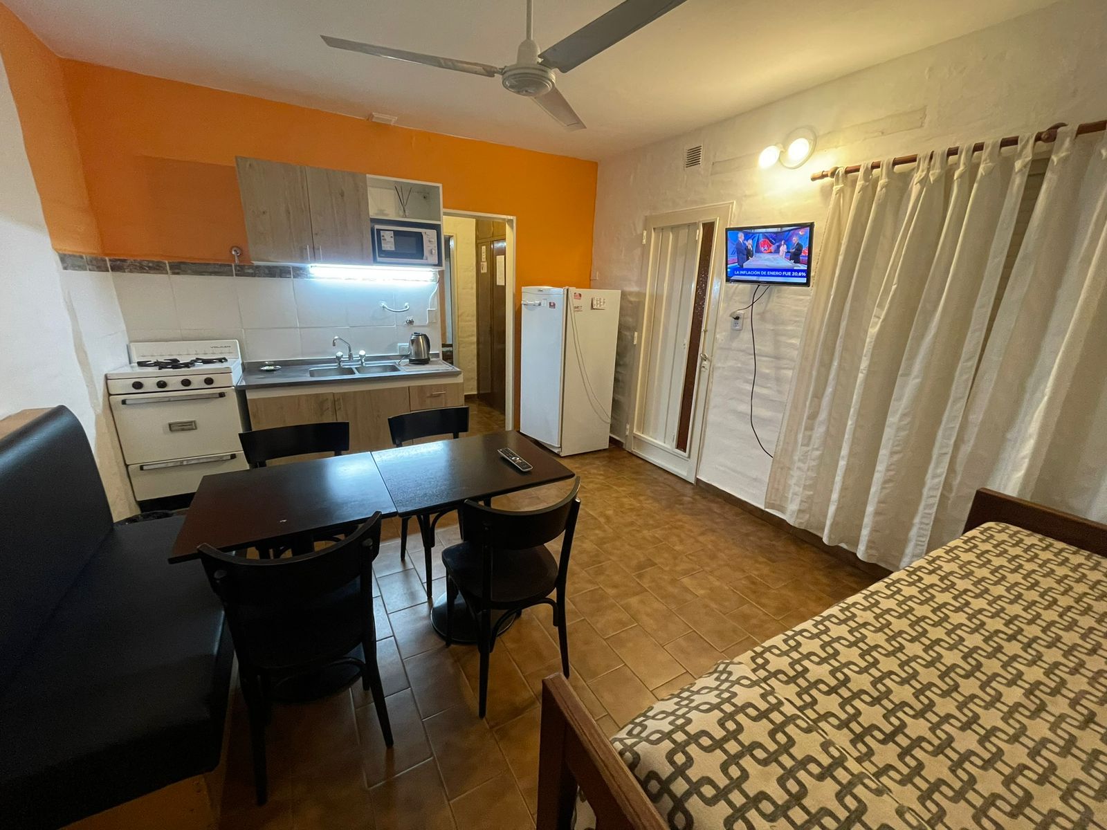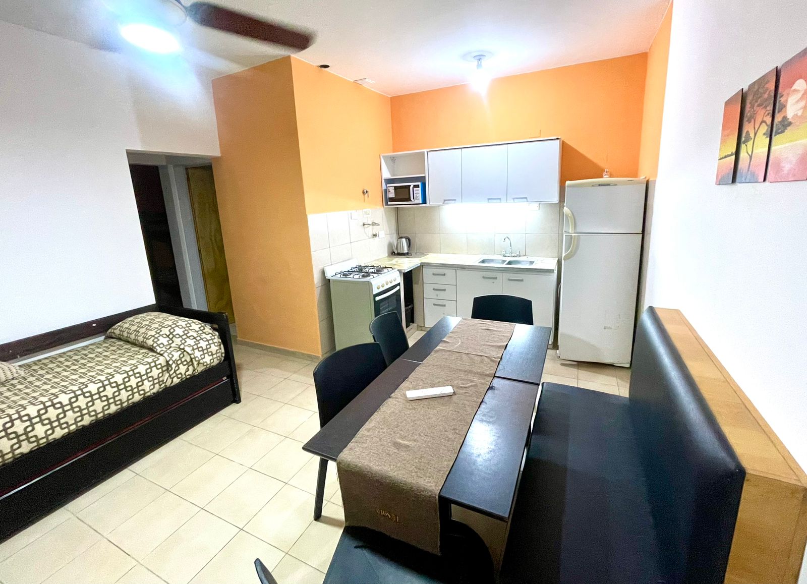 Estar-Comedor: Mesa, sillas, mesada con pileta, cocina con horno, heladera, microondas, pava, cafetera manual, bajo mesada con vajilla, cama simple sommier o sofá cama, ventilador de techo.