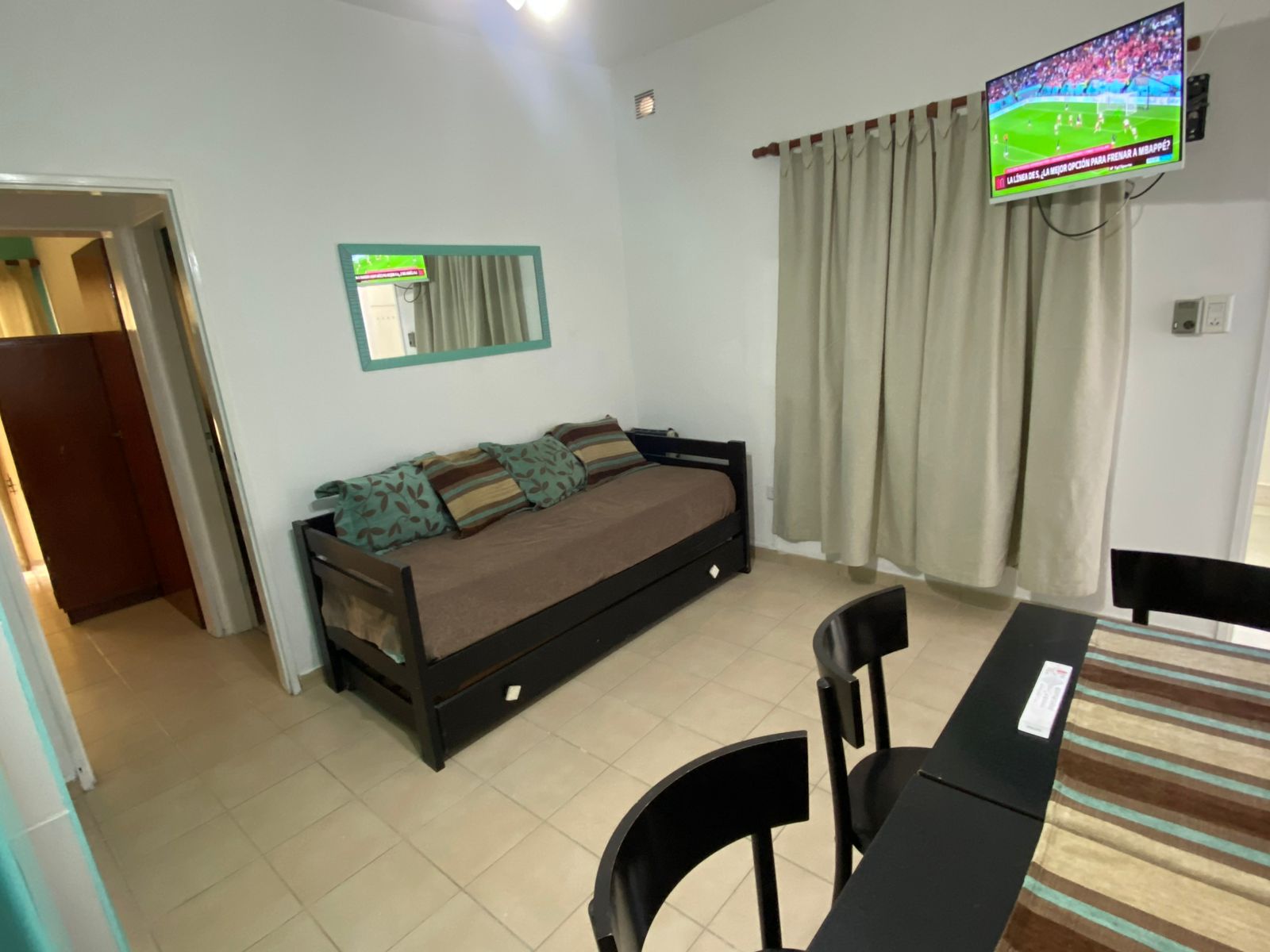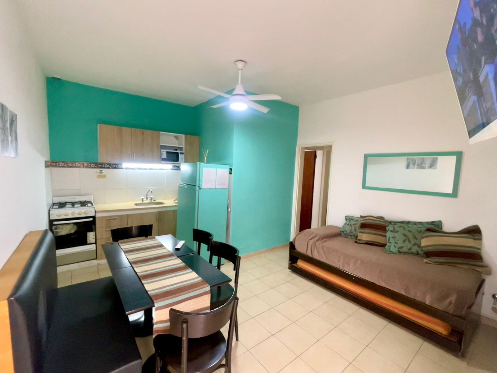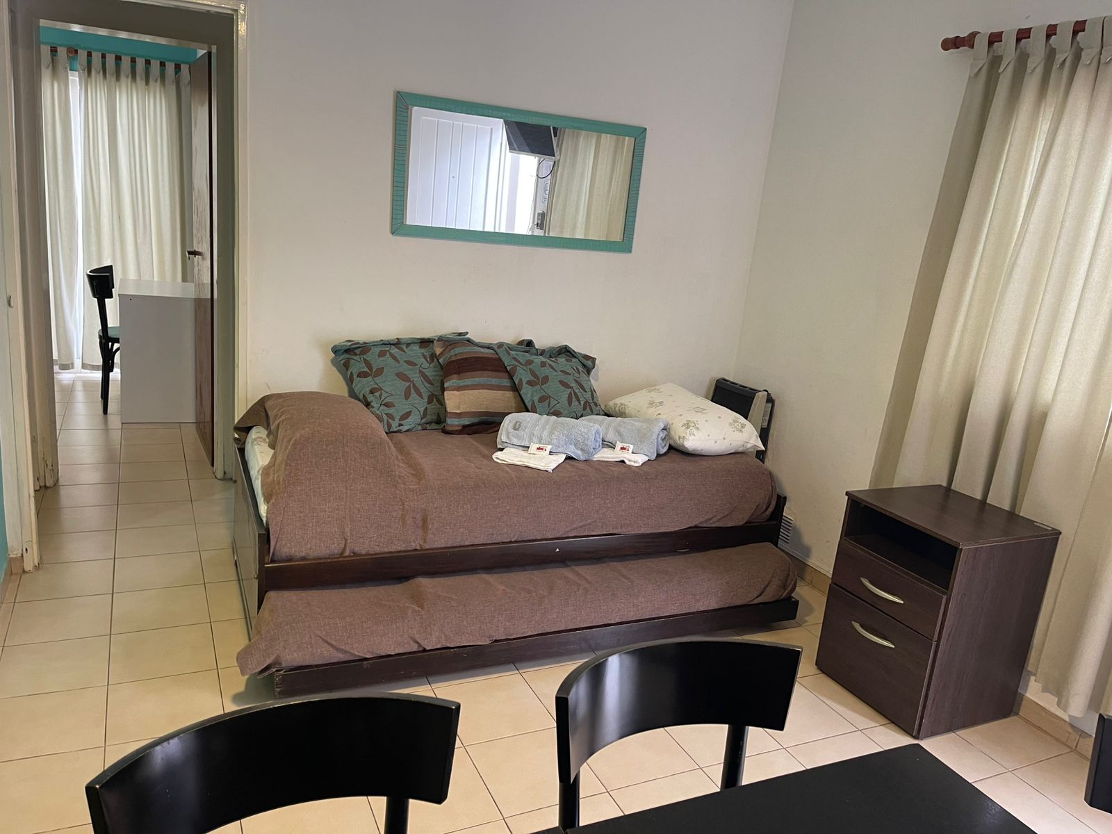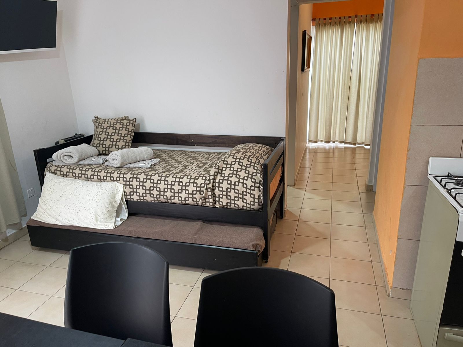 Estar-Comedor: Mesa, sillas, mesada con pileta, cocina con horno, heladera, microondas, pava, cafetera manual, bajo mesada con vajilla, cama simple sommier o sofá cama, ventilador de techo.