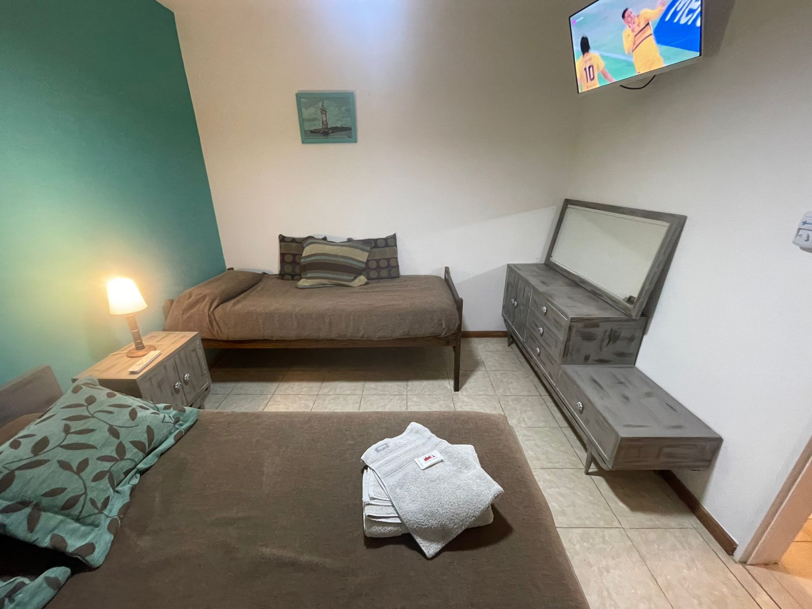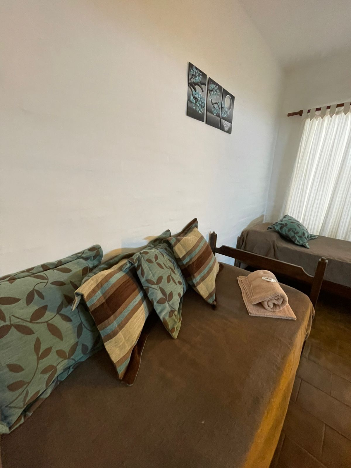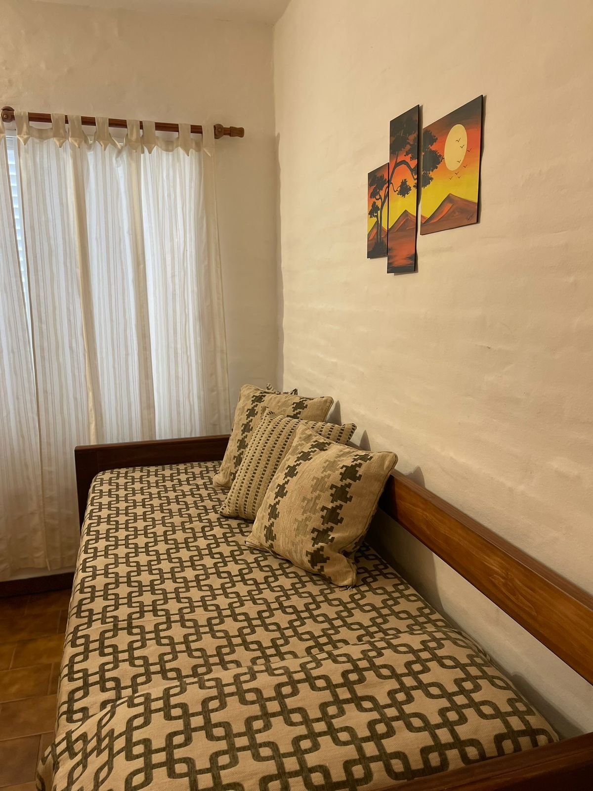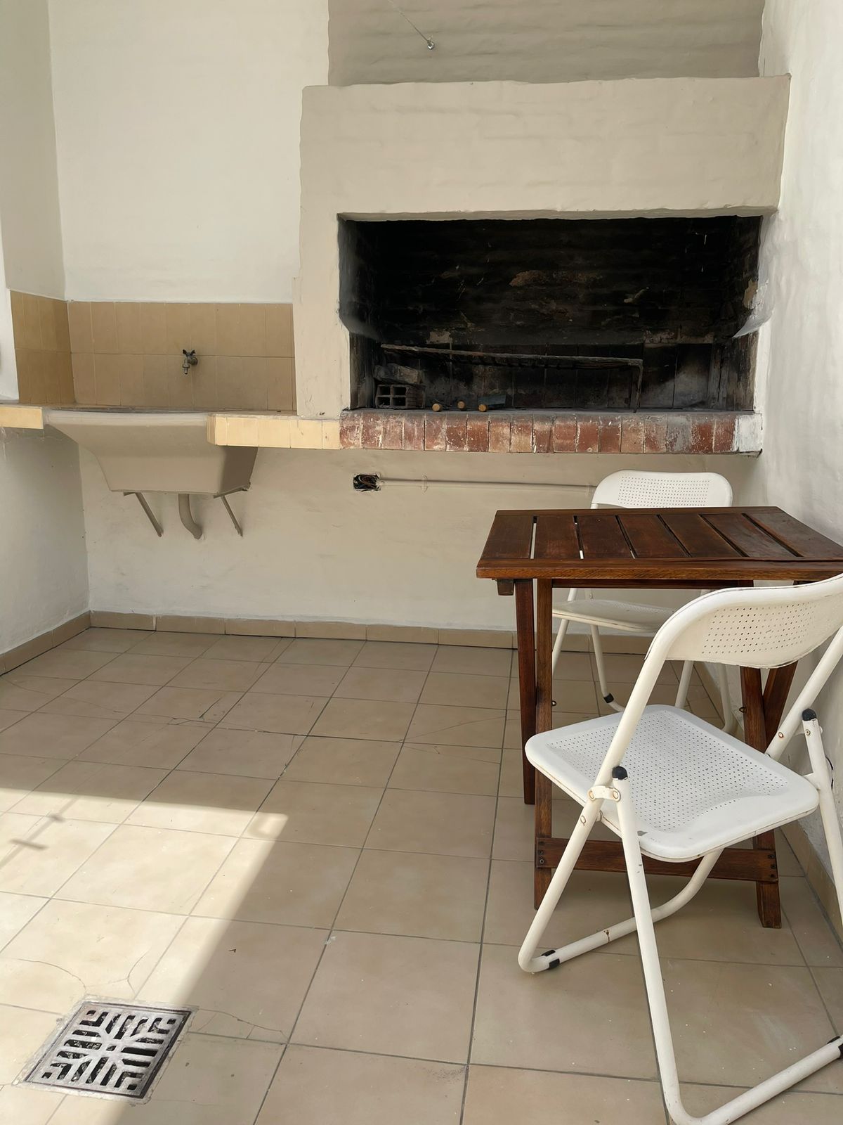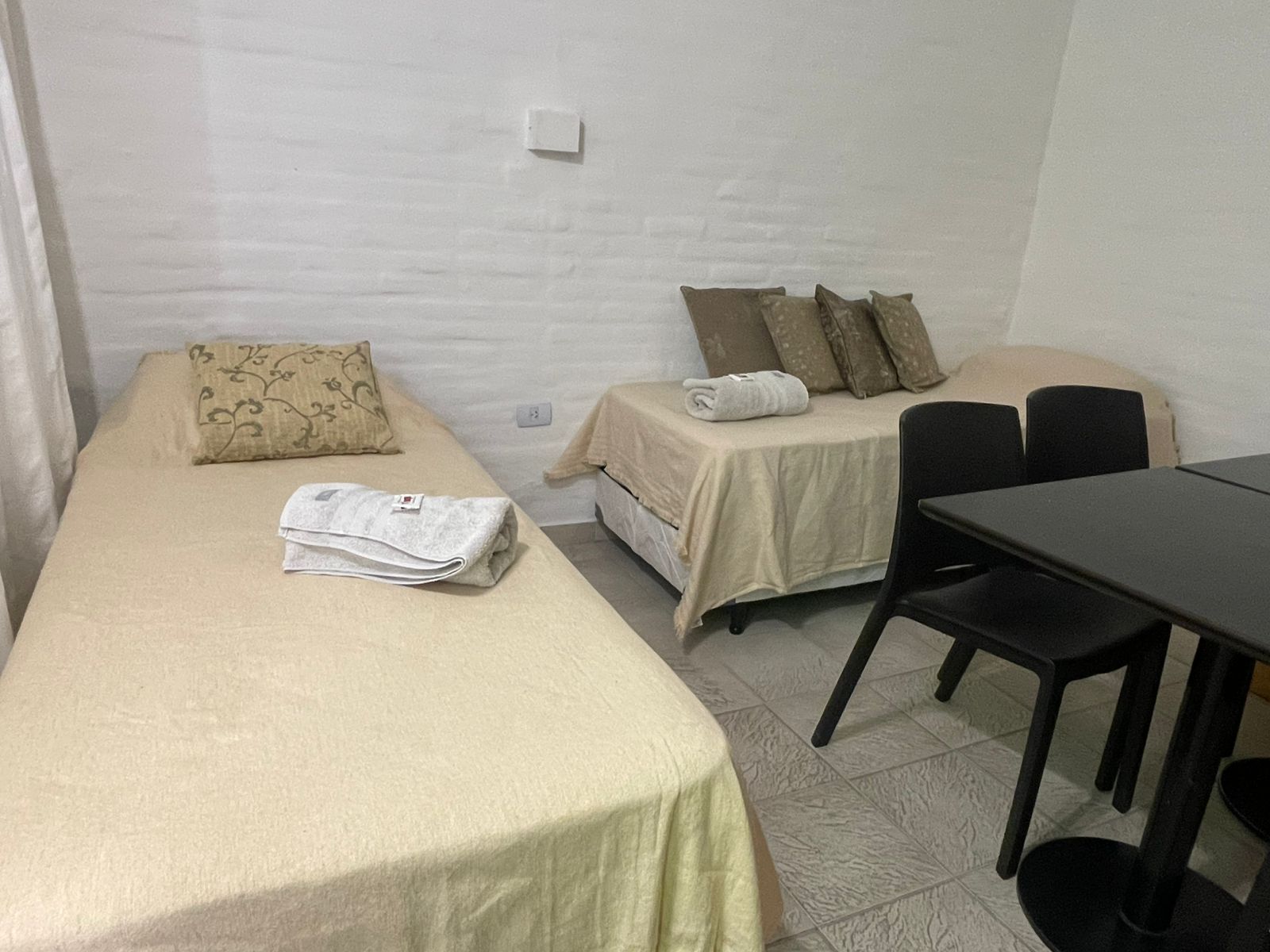 Estar-Comedor: Mesa, sillas, mesada con pileta, cocina con horno, heladera, microondas, pava, cafetera manual, bajo mesada con vajilla, cama simple sommier o sofá cama, ventilador de techo.